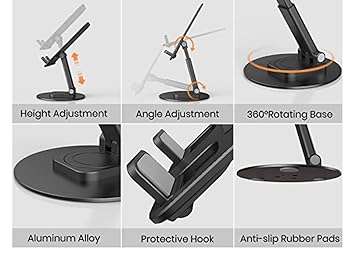 • 【360-DEGREE ROTATABLE STURDY ALUMINIUM BASE】The cell phone holder features a 360° rotatable axis connecting with the strong and sturdy Aluminium base. The smooth rotatable base of this phone stand allows you to swivel your laptop and devices to any adjustable angle. The exquisite groove design of the base match with the adjustable rod allows your device to rest steadily on it, even the tablet with the case. Free your back, shoulder and waist from strain.