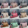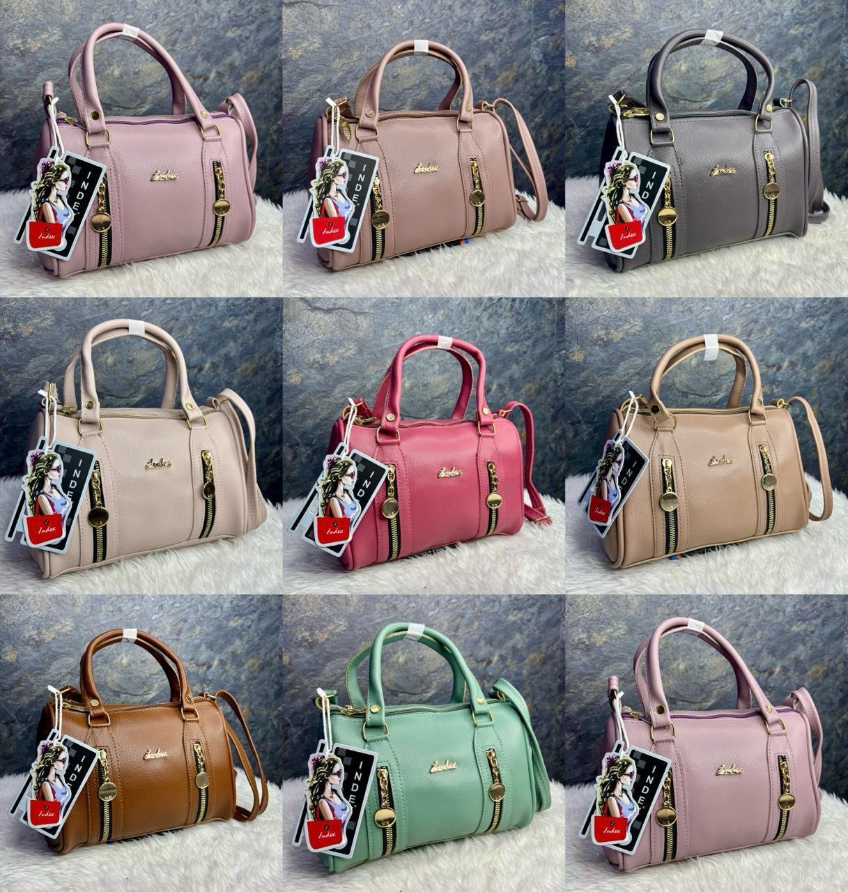 Grid of nine handbags of the same style, presented in various colors including pink, beige, brown, green, and gray