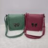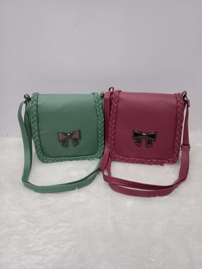 Details: The flap is adorned with a decorative, braided strap detail along its edge, and a small, dark-colored bow embellishment is centered on the front of each bag.