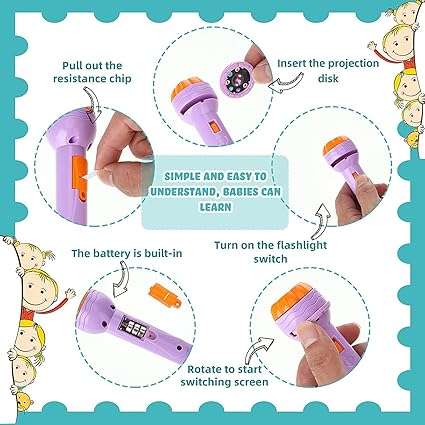 - 1) Safe and high-quality materials :It is made of high-quality ABS environmentally friendly materials, and the smooth edges will not harm children’s small hands. Easy to use. The slide rail can be replaced by simply sliding the plastic cover. Then insert the selected disc and rotate or adjust the disc to observe the projected image. Light and convenient. Can be used as a flashlight to make your child feel safe at night,