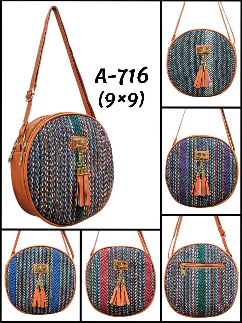The bags feature a woven, multi-colored fabric body with a textured, striped pattern, complemented by tan or brown leather-like accents on the edges, strap, and tassel details.