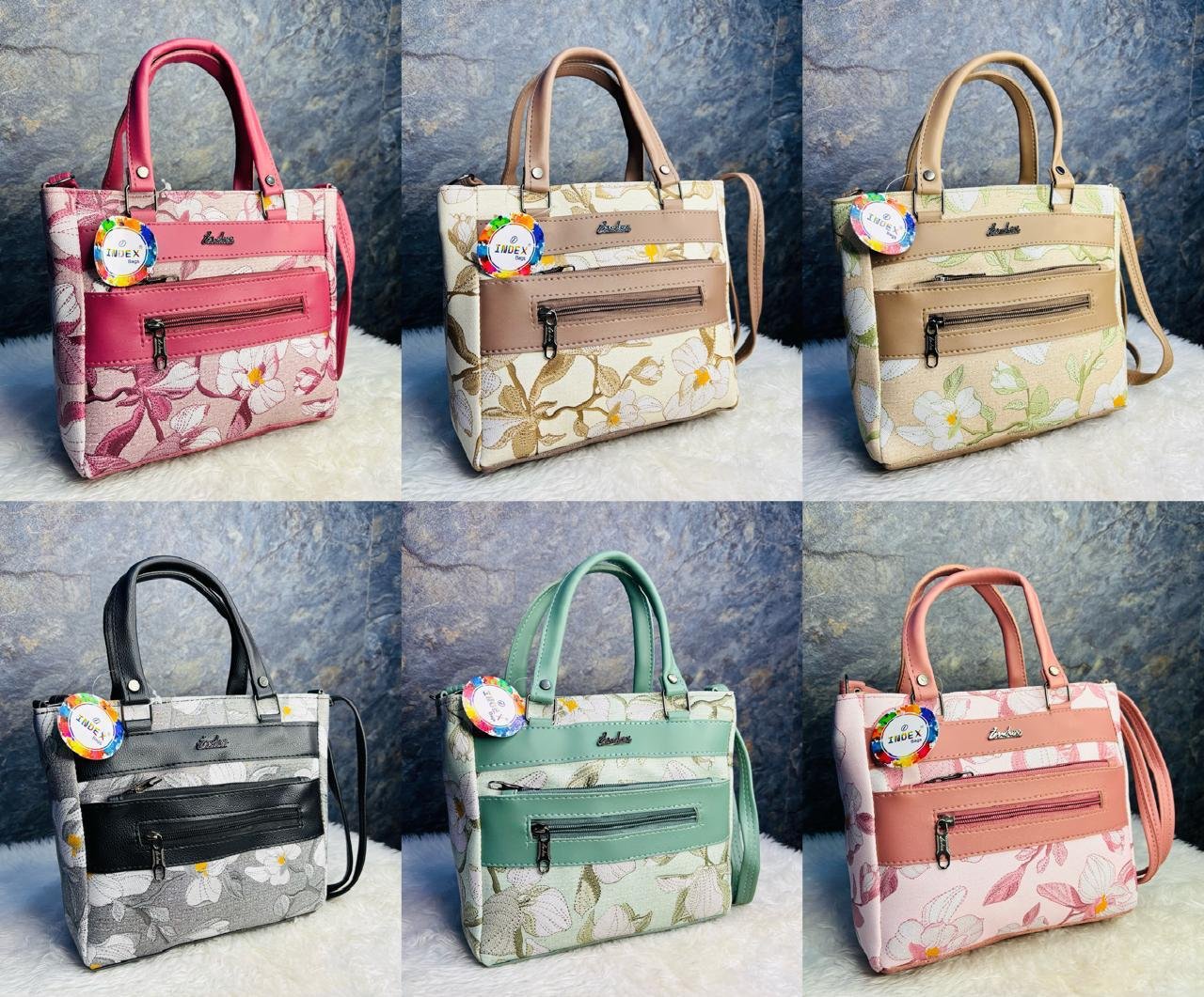 All handbags share common design elements, including a top handle, a zippered main compartment, and an additional front zippered pocket. They also appear to have a small tag or charm attached to the handle.