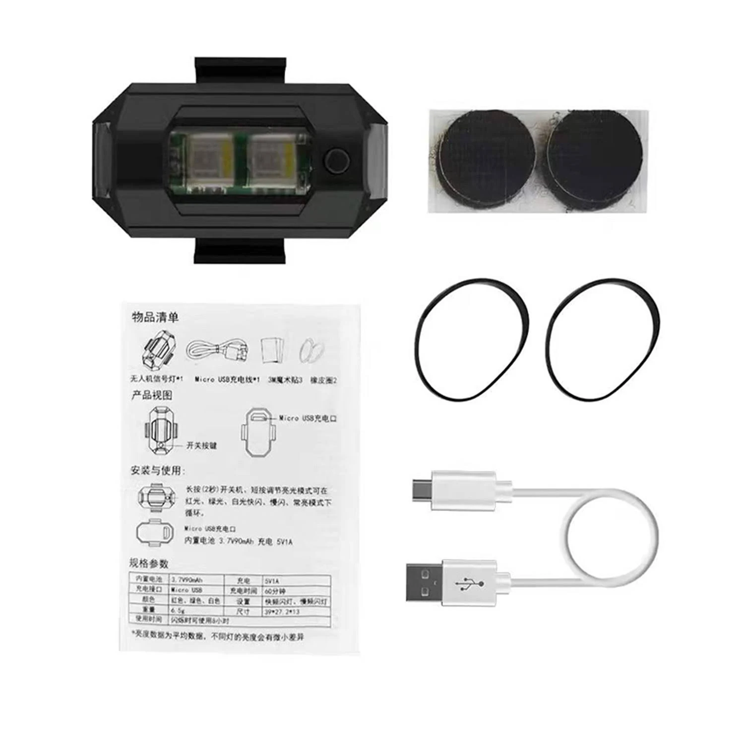 - USB CHARING PORT: USB cable charge, Built-in 90mAh battery. There is a button on the front of the mini strobe light, press 2 seconds to start the lights or turn off the lights and change color and mode, while the light getting low brightness means you need to charge (the red light will be on).